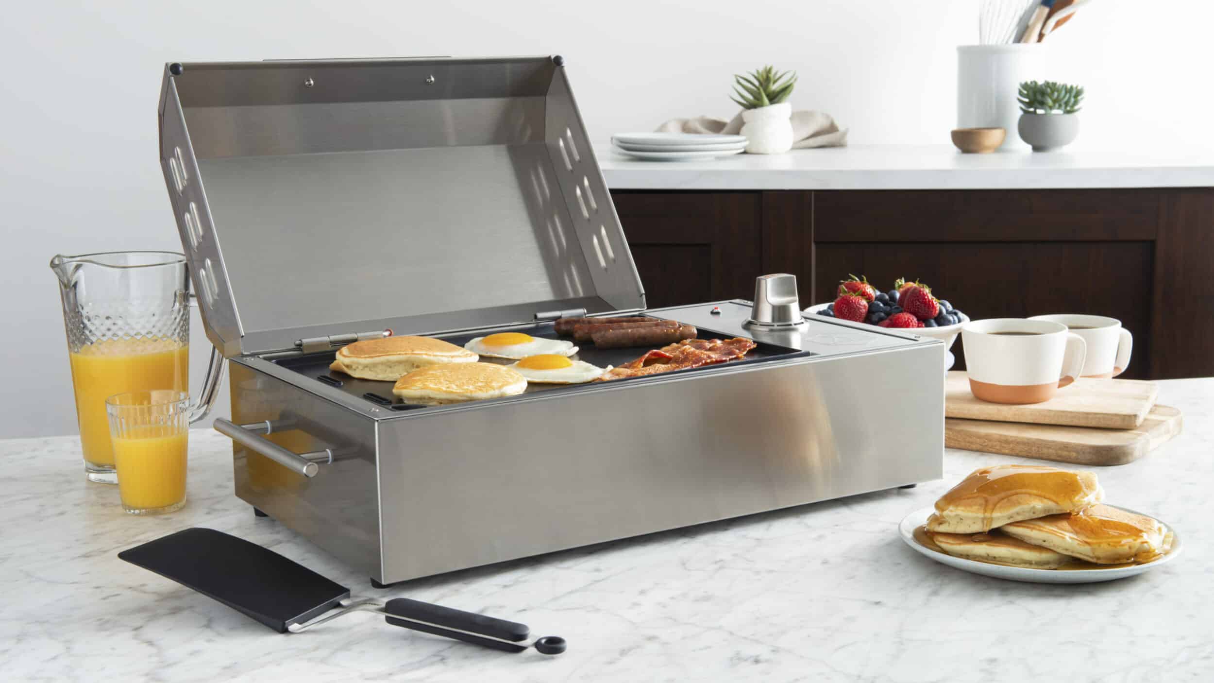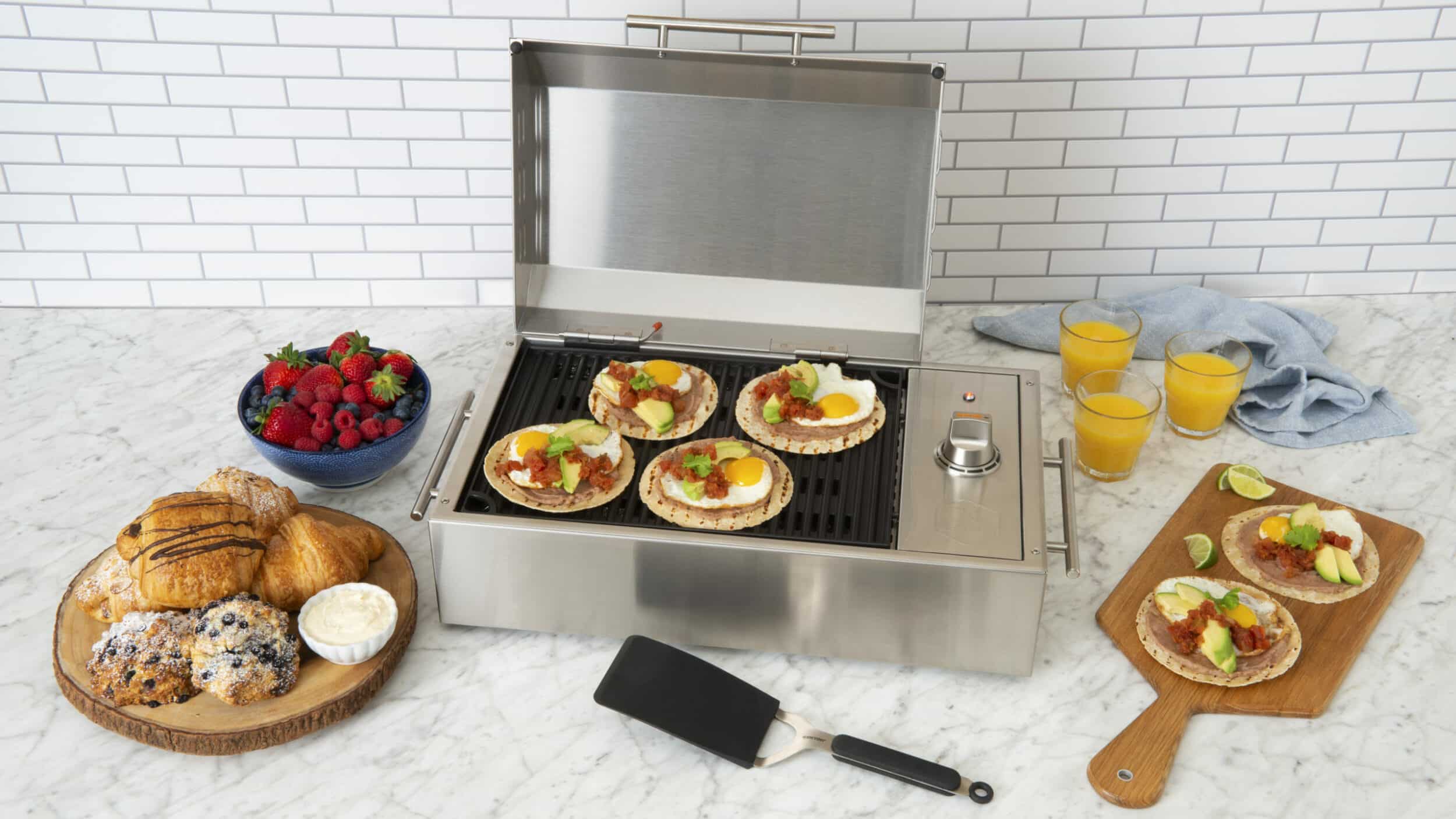 Packs generous workspace for prep, cooking and serving all into a freestanding electric grill.