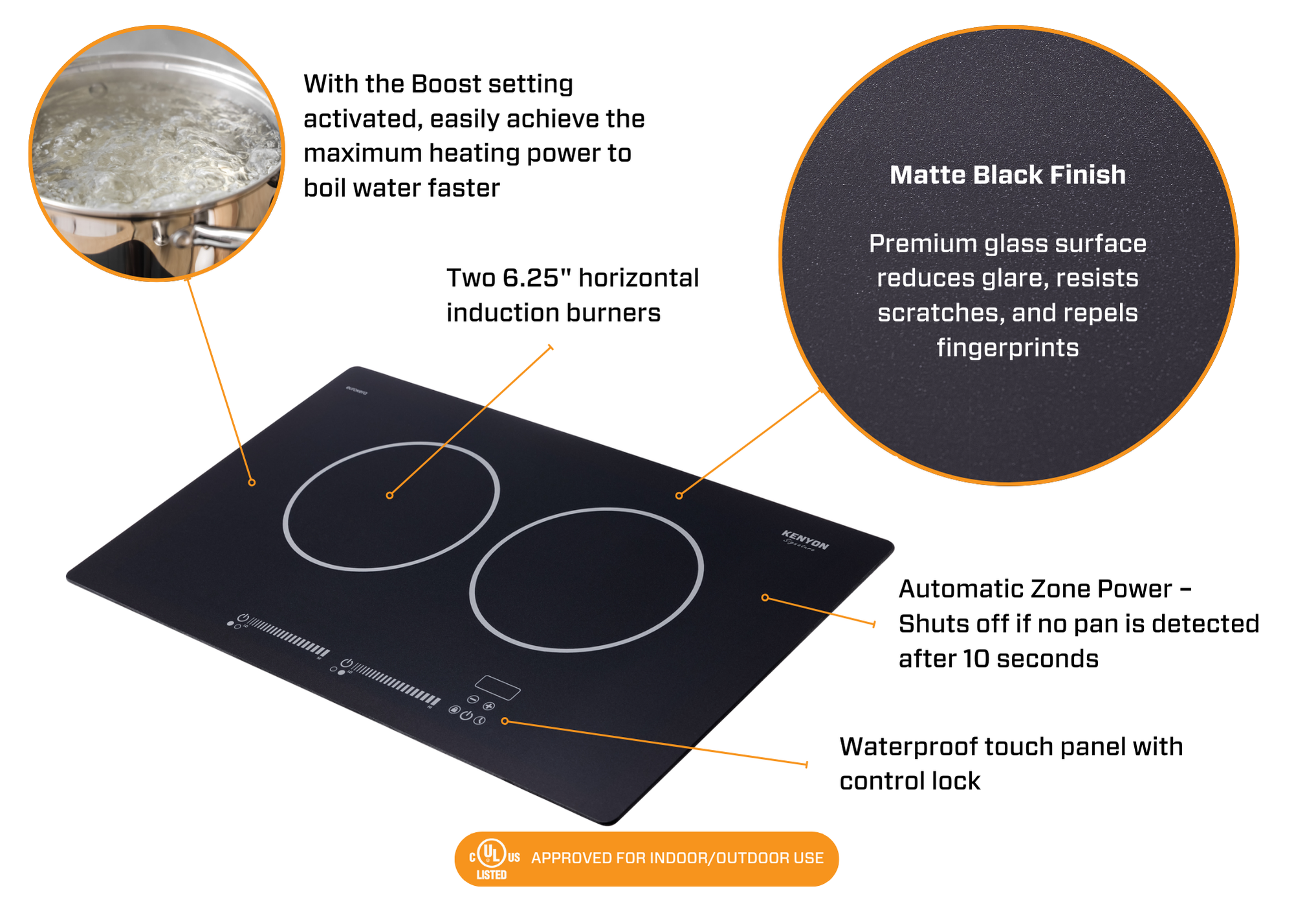 Introducing the Kenyon Signature® Induction 2 Burner Cooktop in a convenient landscape layout with two 6.25″ burners placed side by side, offering ample space for your culinary creations. The matte black glass-ceramic surface reduces glare, hides fingerprints, and delivers a refined look customers immediately notice. It feels premium, looks incredible, and stays clean with minimal effort. Kenyon is the only brand offering a matte finish in a 2-burner induction size, giving homeowners, boaters, and RV owners a design-forward option not found elsewhere. UL / C-UL approval provides added confidence for residential and mobile installations. Slide touch controls offer smooth heat adjustment with boost and simmer settings. The Bridge feature creates a larger cooking zone for griddles and oversized pans. Convenience and safety come from ADA-compliant access, a waterproof touch panel, control lock, automatic zone shutoff, fast heat dissipation, and a warming timer. The Signature® Induction Series brings elevated style and modern performance to any kitchen or galley.