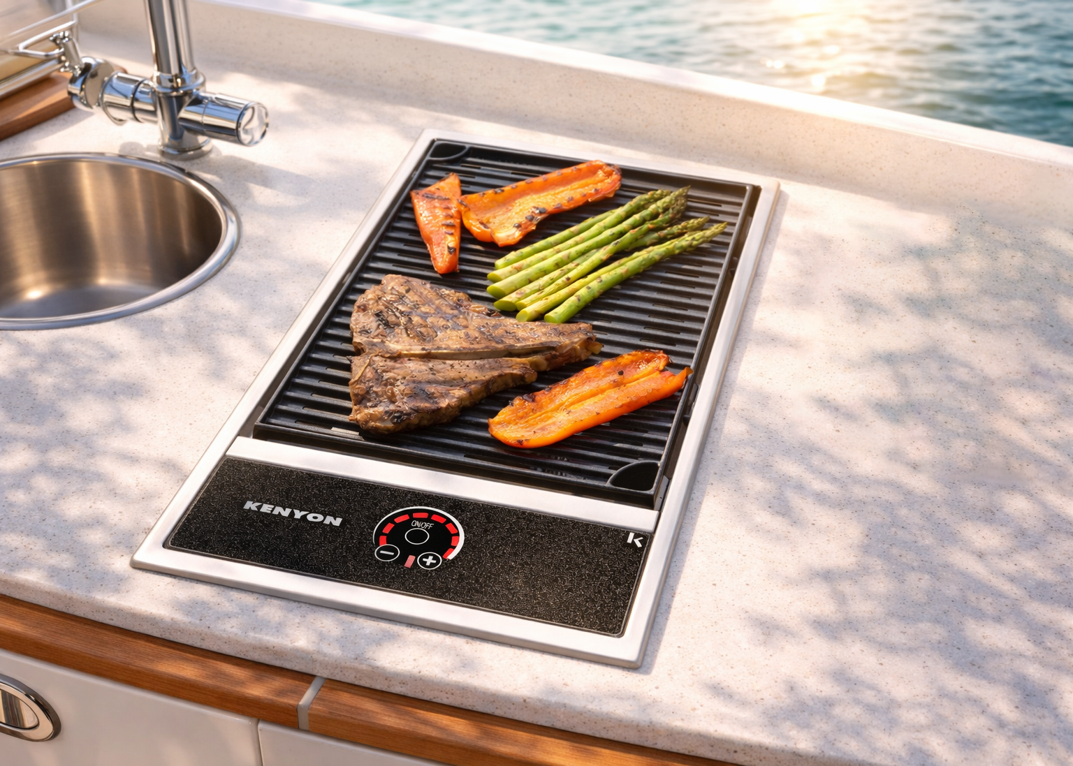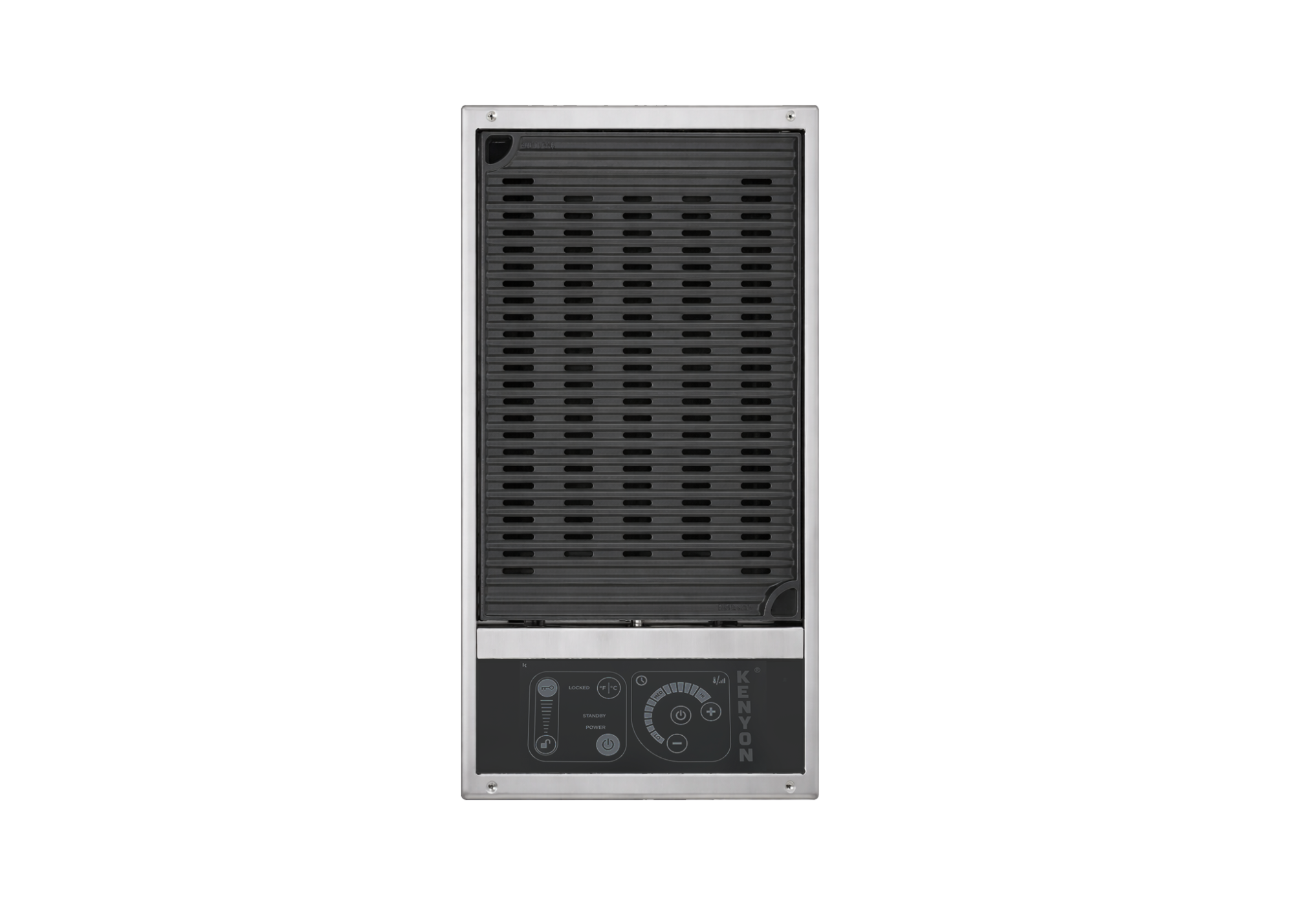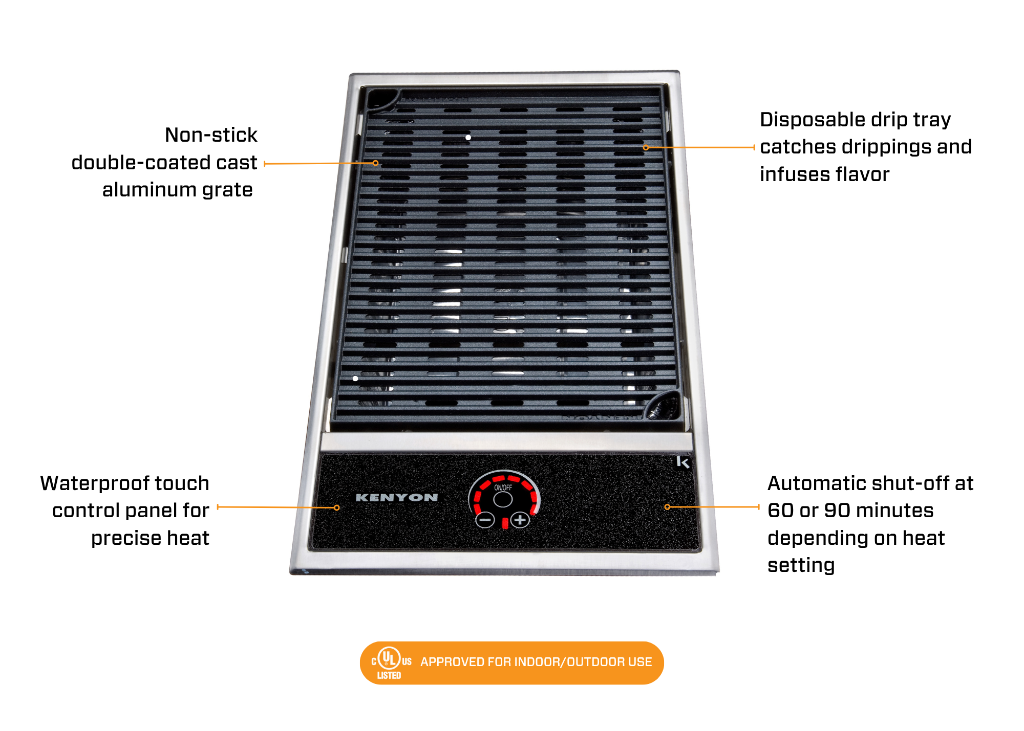 The No Lid Built-In Grill (Portrait) is a 120V or 240V electric grill designed for installations with limited height clearance. By eliminating the lid, it provides a low-profile cooking surface while maintaining the performance of a traditional electric grill. This compact, single-burner grill reaches temperatures up to 550°F and delivers consistent, even heat without flare-ups. Available with either standard touch control or IntelliKEN Touch™ control, it supports simple heat adjustment or advanced cooking with Precision Control and Direct Temperature Feedback for consistent, repeatable results. Automatic shut-off at 60 or 90 minutes adds an extra layer of safety. Constructed from marine-grade stainless steel, the grill is built for durability across residential, marine, and mobile applications. Patented medical-grade, PFOA-free non-stick grates are dishwasher safe for simplified cleanup.